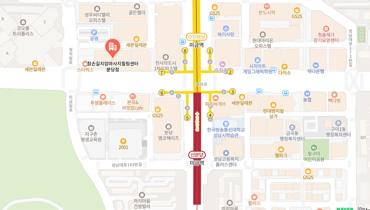 참손길 분당점은 미금역 7번 출구 도보 3분 거리에 위치하고 있습니다.